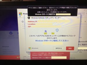 パソコンがウイルスに感染した ピーという音が鳴り、操作できない、怪しい電話番号が表示されているとのことでご依頼いただきました。