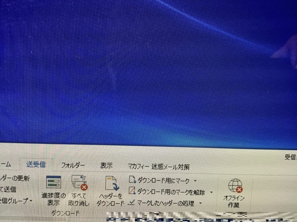 原因を調べたところ、オフライン作業にチェックが入っているので、メールの送受信ができなくなっているということが判明しました。